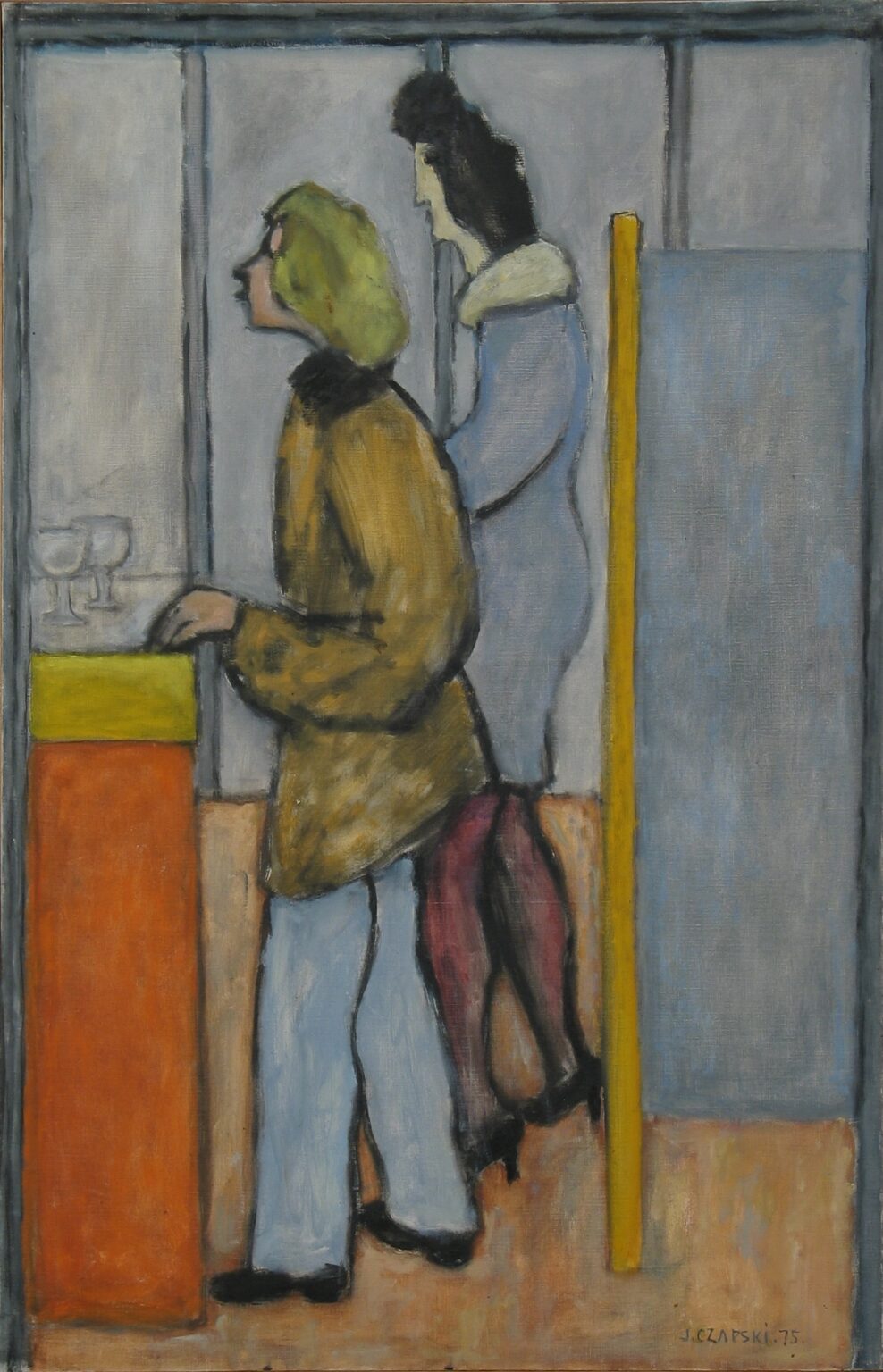 Obraz przedstawia scenę w kawiarni i wyróżnia się otwartą, wyrazistą kompozycją. Dwie osoby stojące przy barze zostały ukazane w syntetyczny sposób — jako plamy koloru obwiedzione wyraźnym konturem, co nadaje całości ekspresyjny charakter. Takie rozwiązania pokazują, że Czapski nie trzymał się ściśle zasad kapistów, którzy kładli nacisk przede wszystkim na samą wartość koloru, lecz poszukiwał własnego, bardziej zróżnicowanego języka malarskiego.