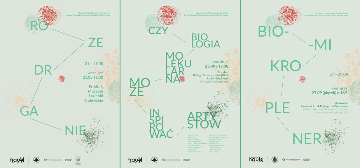 Od 21 do 29 września odwiedzający Łazienki Królewskie w Warszawie mogli zapoznać się z twórczością trzech artystek, dydaktyczek Akademii Sztuk Pięknych w Warszawie, często współpracujących z naukowcami z dziedziny biologii: dr hab. Katarzyny Proniewskiej-Mazurek, dr Joanny Dudek oraz dr Joanny Lelonek.