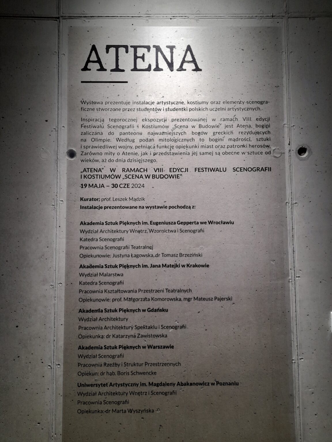 Wystawa została zorganizowana w ramach festiwalu scenografii i kostiumów „Scena w Budowie”. Uczestnicy w swoich pracach w ciekawy sposób nawiązali do tytułowej bohaterki wystawy „Atena” oraz zaprezentowali autorskie projekty, w których wykorzystano różnorodne materiały i techniki. Podczas otwarcia wystawy Julia Smogorzewska otrzymała wyróżnienie za swój projekt. Gratulacje!