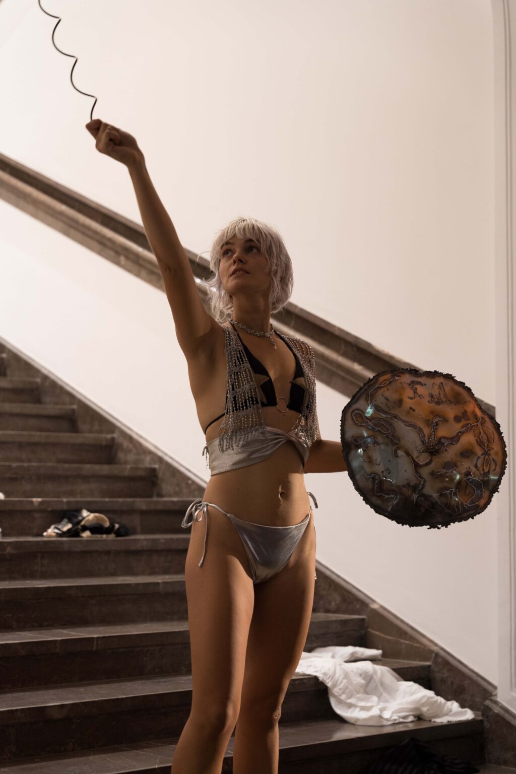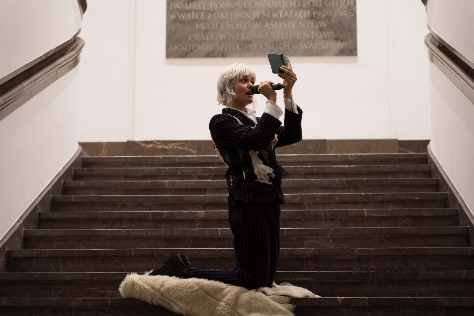 Aby zgłębić ewolucję świadomości twórczej, performerka stanie się medium – przeniknie przez nią czas, historia i pamięć. Przeprowadzi widownię przez historyczne konteksty i emocjonalne stany artystyczne, archetypy, etosy, wartości oraz ego twórczyń i twórców z różnych epok, ukazując transformacje ich roli w (art)worldzie i (wszech)świecie. Uwaga: Nikt nie odpowie sobie na pytanie, czy artyst_ kształtuje świat, czy świat kształtuje artyst_?