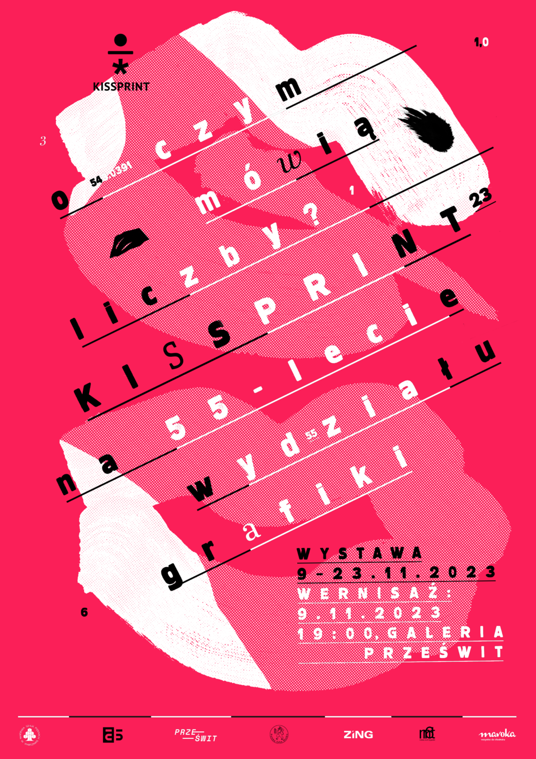 Plakat promujący KISSPRINT23: „O czym mówią liczby?”. Wystawę młodej grafiki warszawskiej