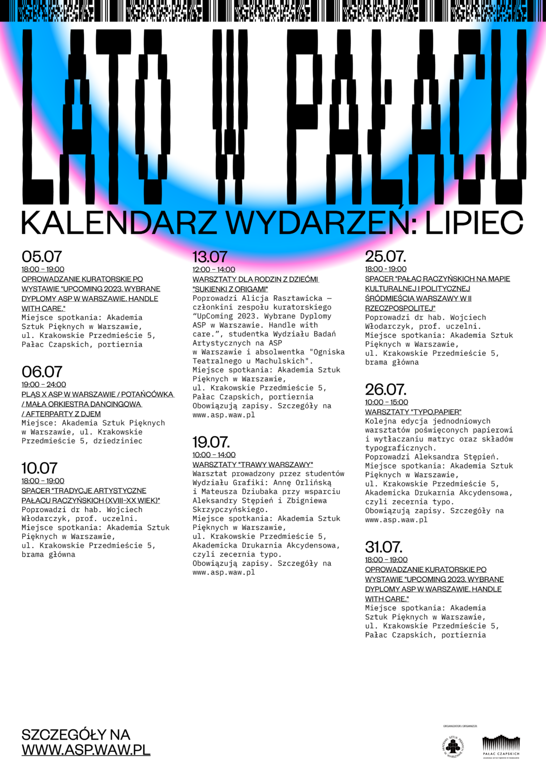 Tegoroczna edycja LATA W PAŁACU w dużej mierze koncentruje się wokół tematyki wystawy “UpComing 2023. Wybrane Dyplomy ASP w Warszawie. Handle with care”, którą przez całe wakacje –do 15 września, od wtorku do niedzieli w godzinach 12:00-19:00 – można zwiedzać we wszystkich salach ekspozycyjnych Pałacu Czapskich. Wśród propozycji letnich zajęć i aktywności znajdzie się coś dla każdego – niezależnie od wieku, poziomu umiejętności plastycznych czy wiedzy o sztuce.