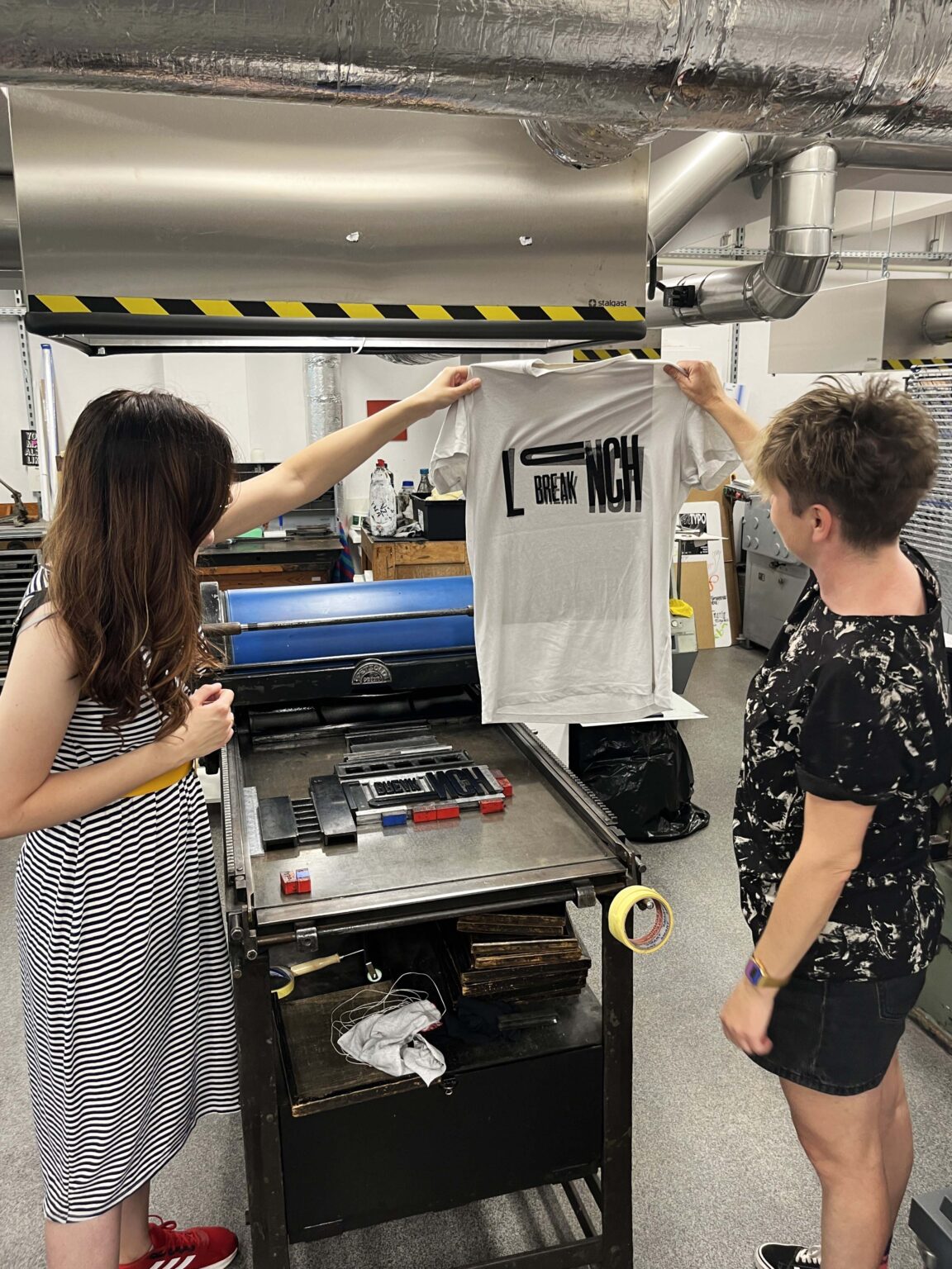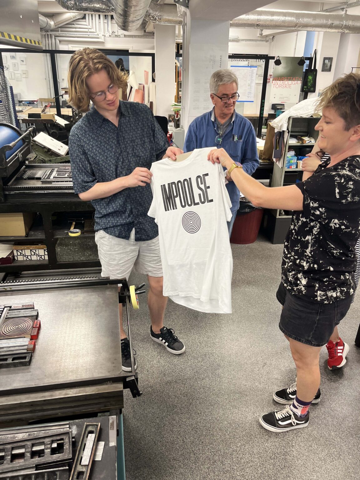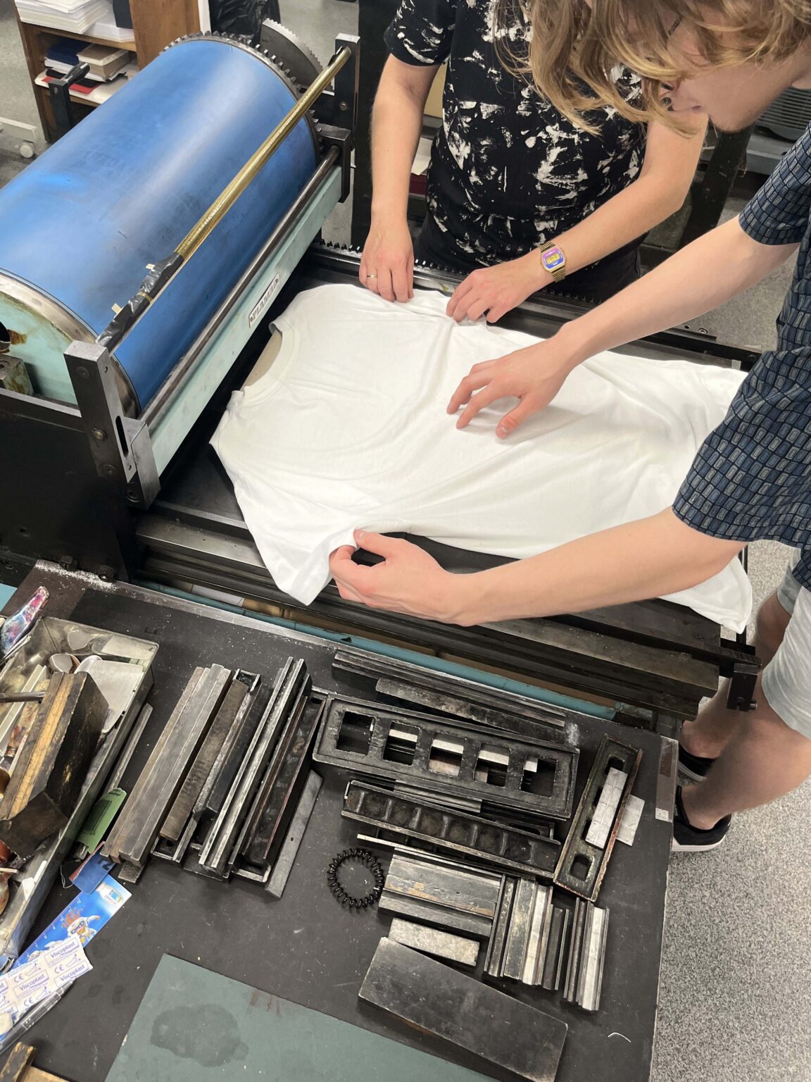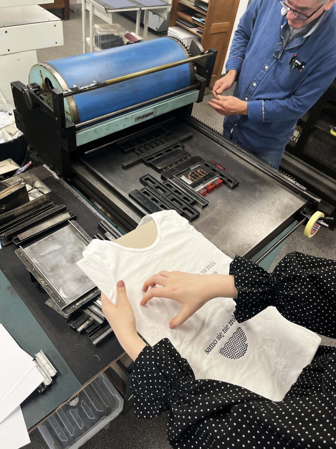 Zadanie polega na zaprojektowaniu prostego przekazu (maksymalnie jednego zdania), złożeniu składu typograficznego (z dostępnych w studio drewnianych czcionek) i odbiciu na T-shirtach przy pomocy prasy typograficznej.