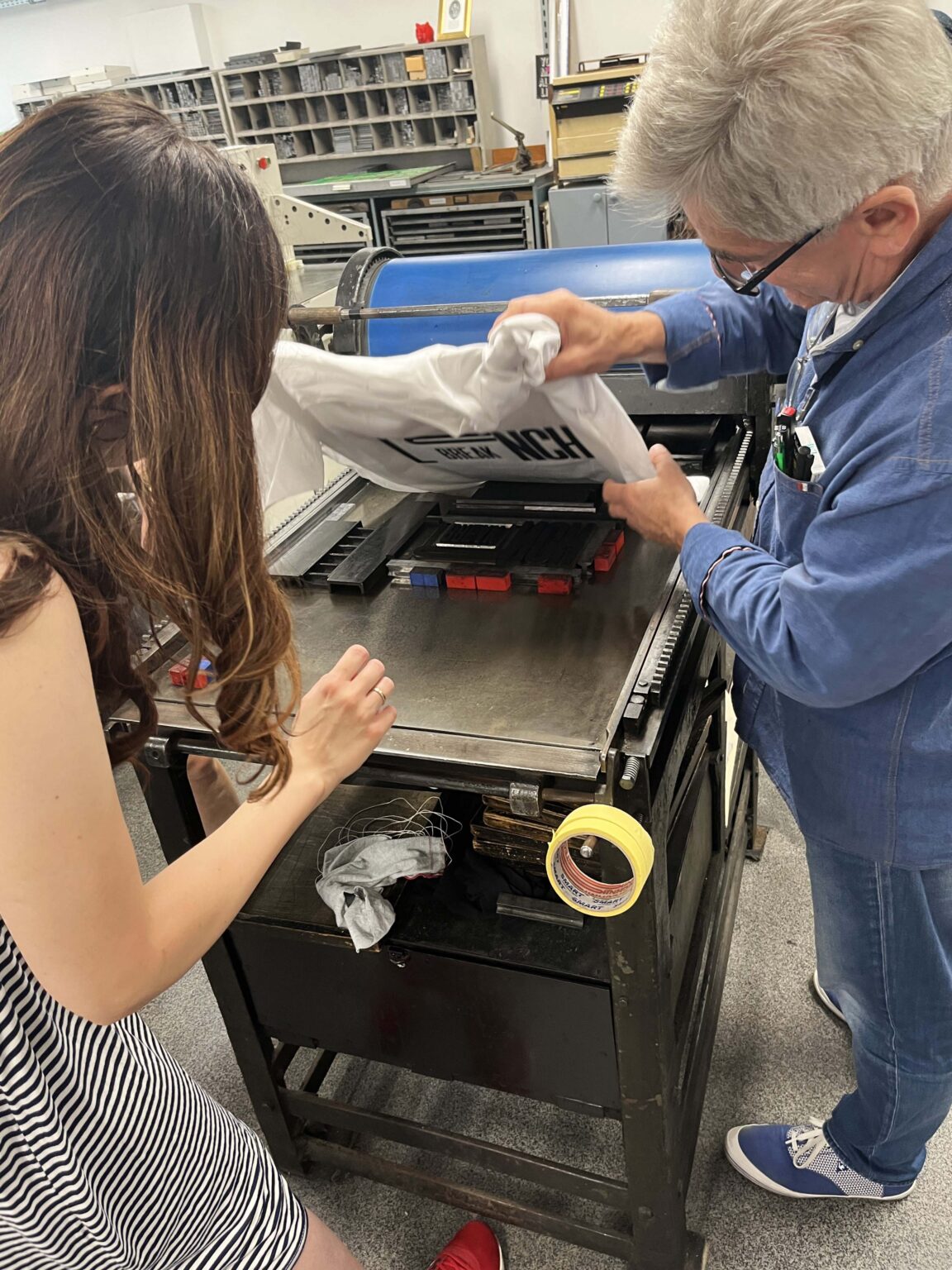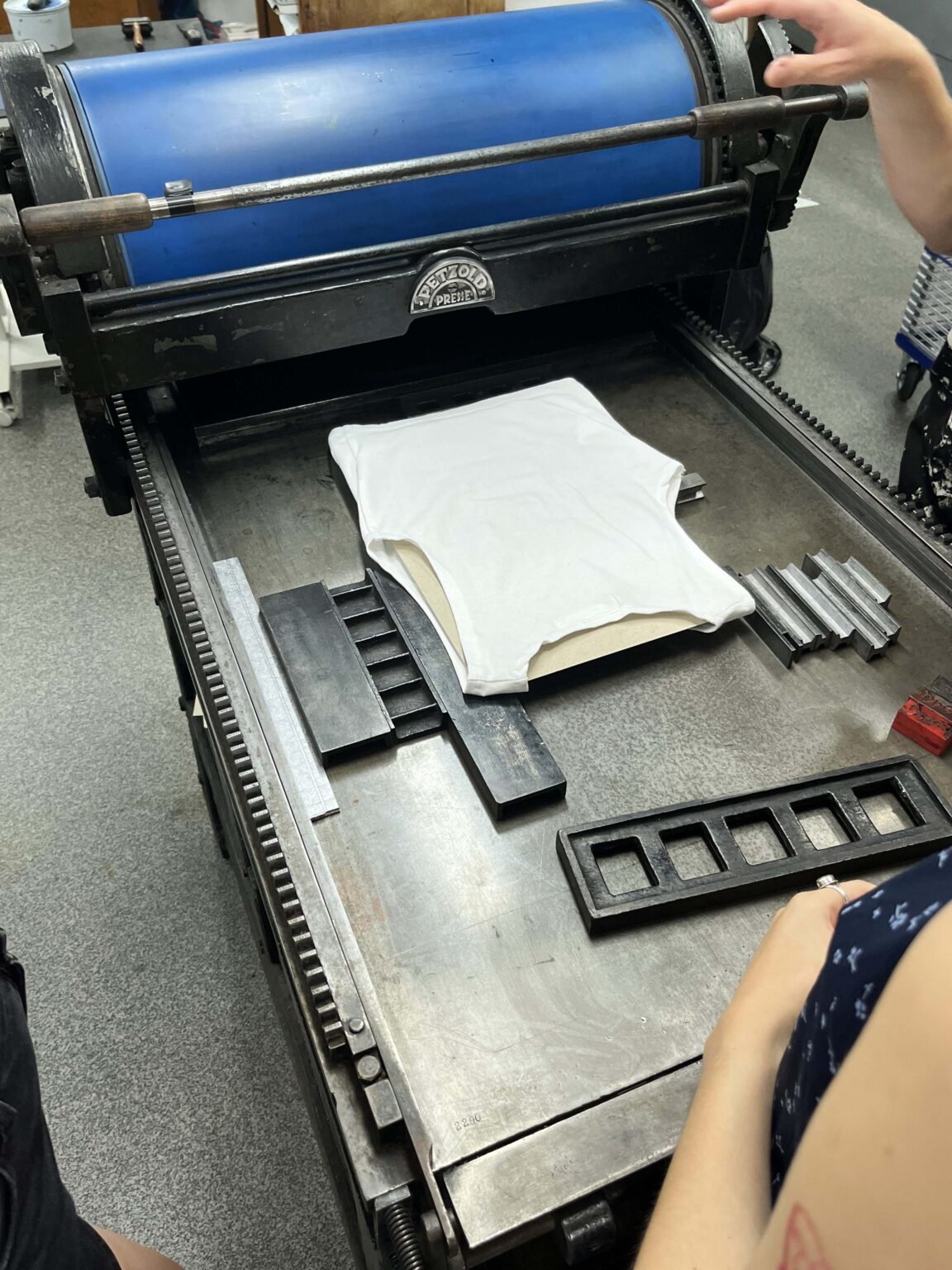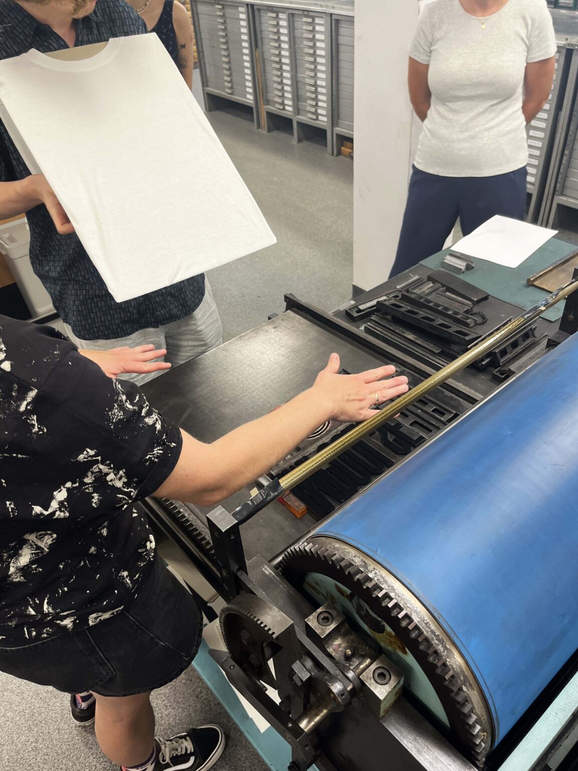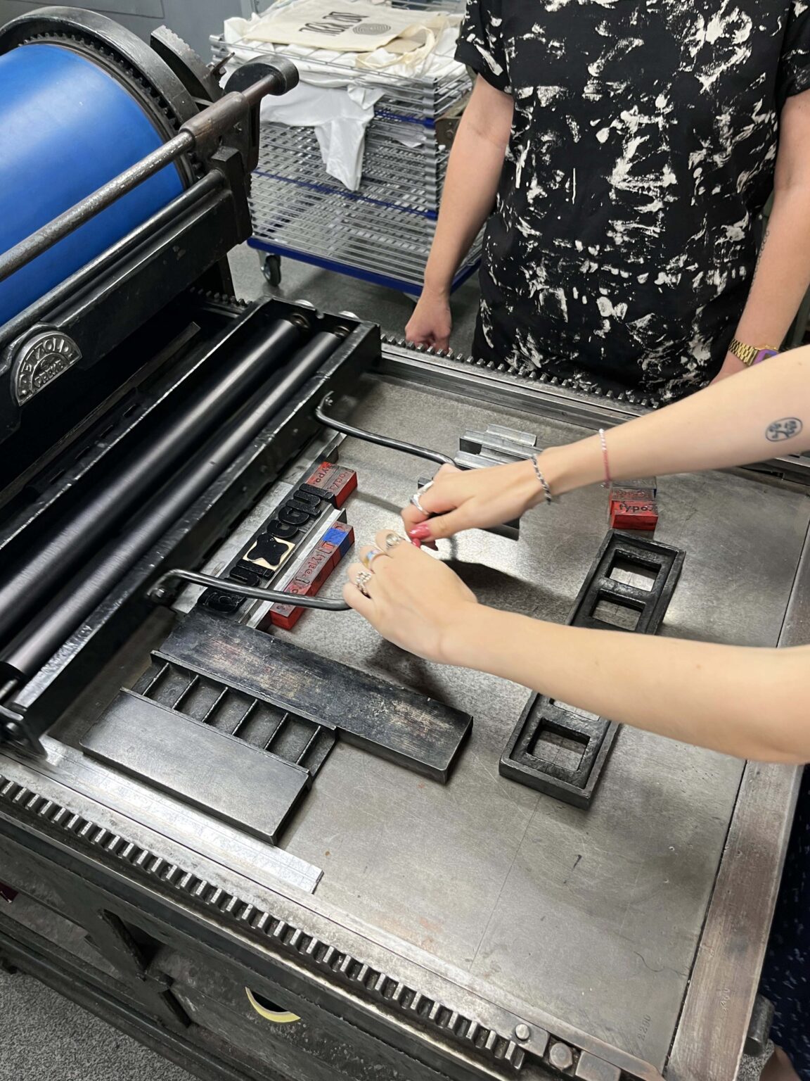 Zadanie polega na zaprojektowaniu prostego przekazu (maksymalnie jednego zdania), złożeniu składu typograficznego (z dostępnych w studio drewnianych czcionek) i odbiciu na T-shirtach przy pomocy prasy typograficznej.