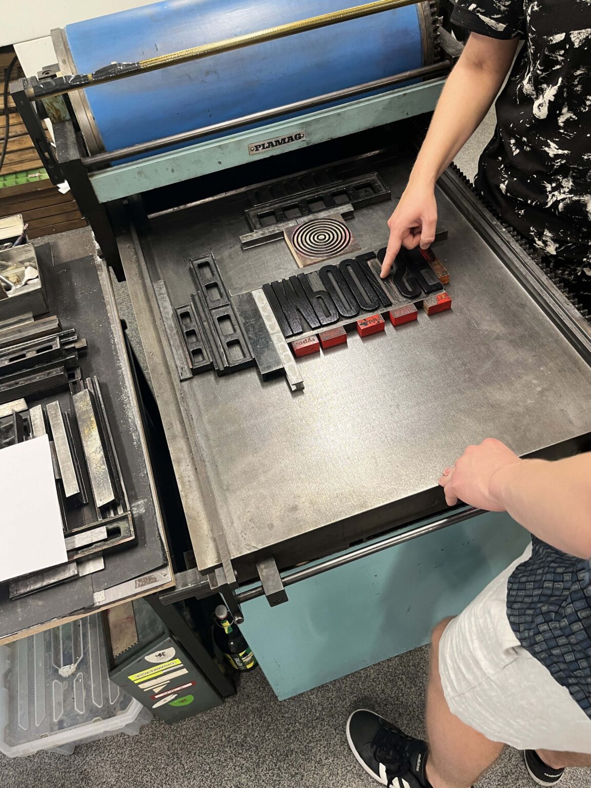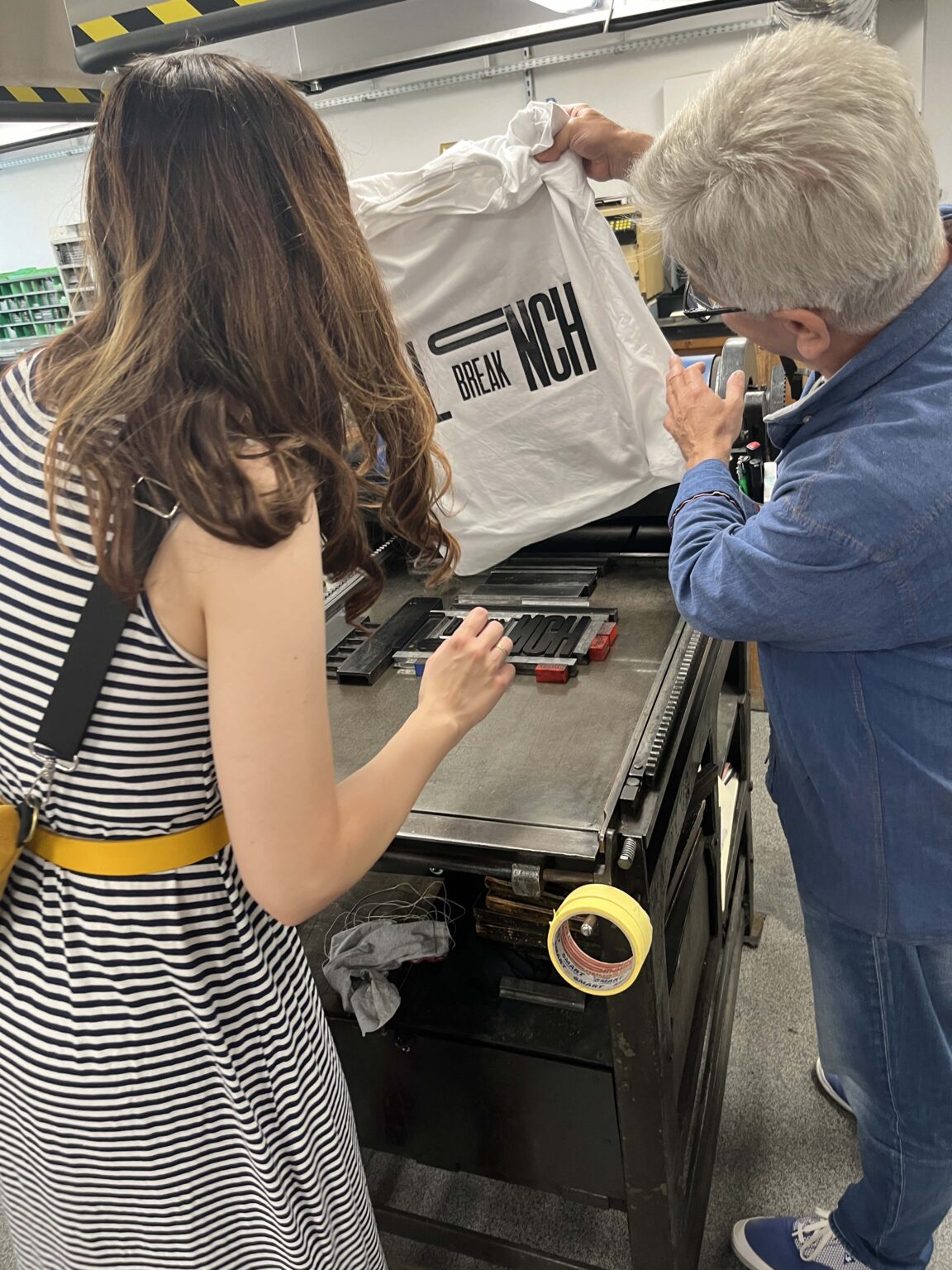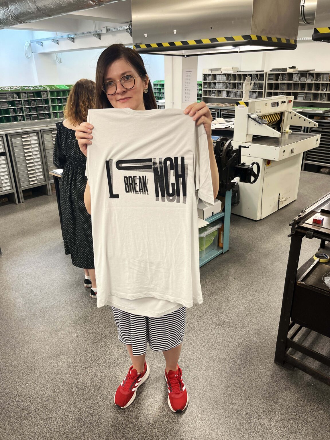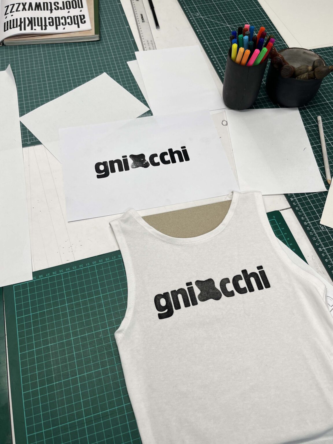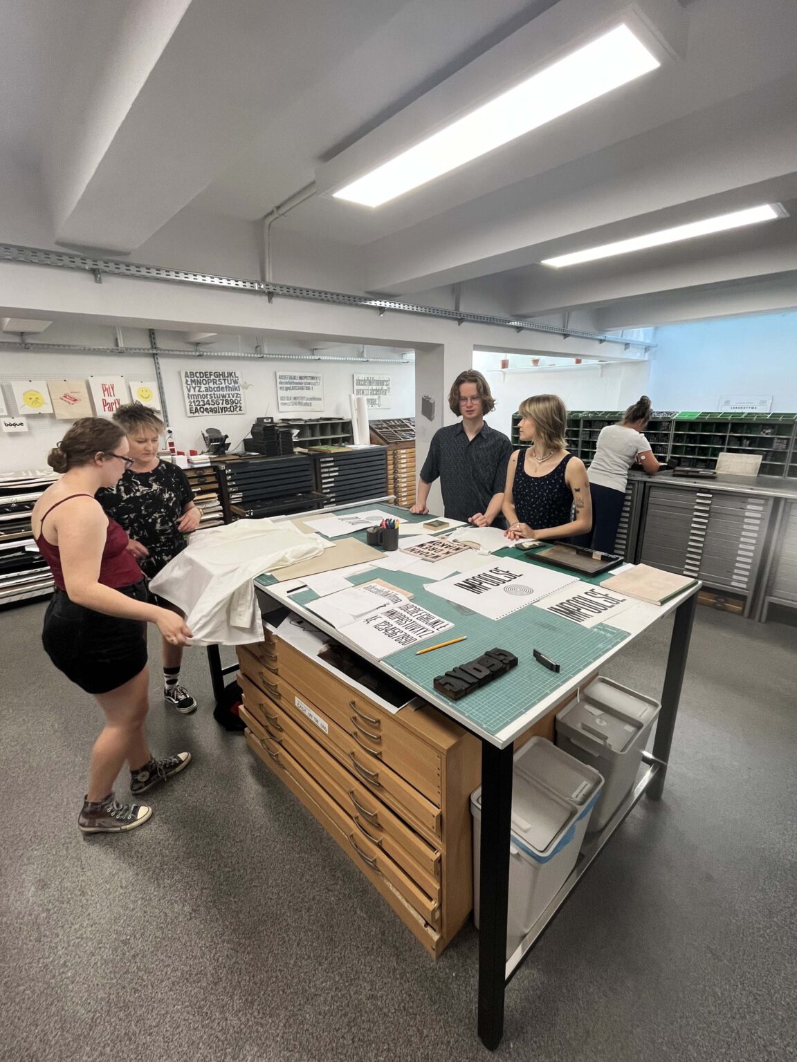 Zadanie polega na zaprojektowaniu prostego przekazu (maksymalnie jednego zdania), złożeniu składu typograficznego (z dostępnych w studio drewnianych czcionek) i odbiciu na T-shirtach przy pomocy prasy typograficznej.
