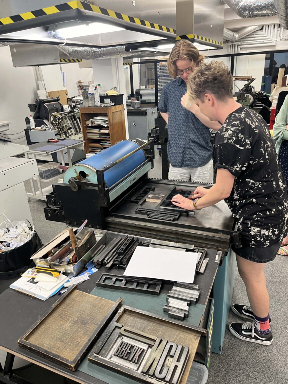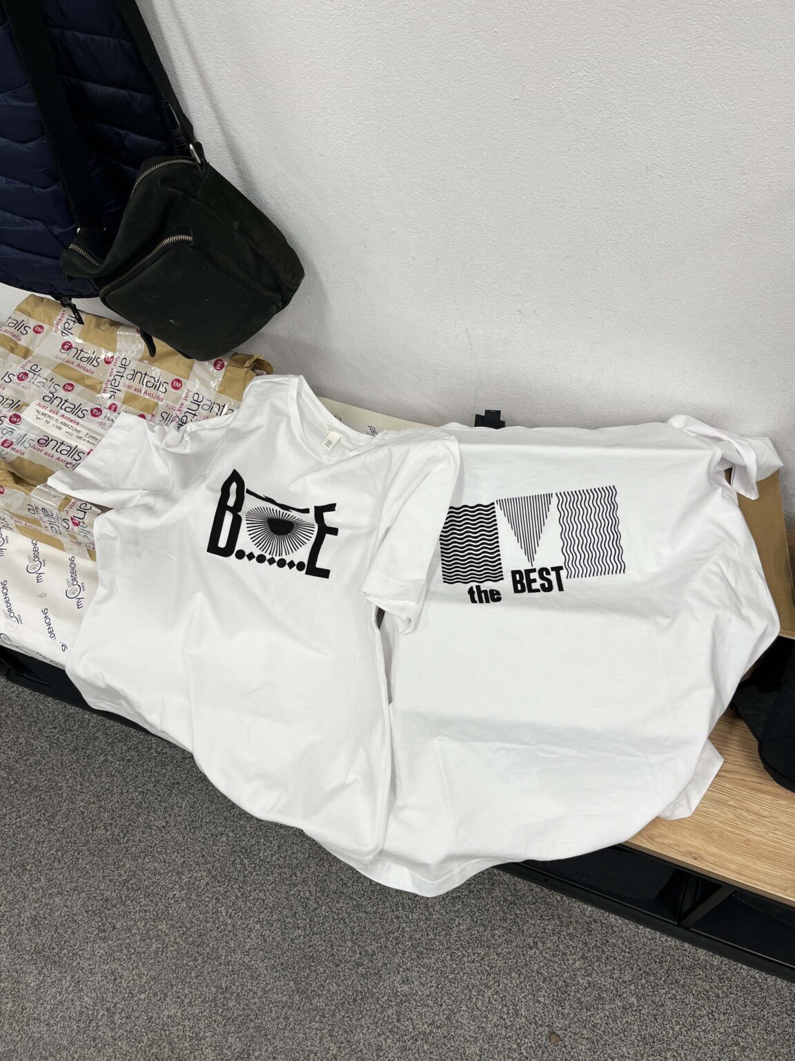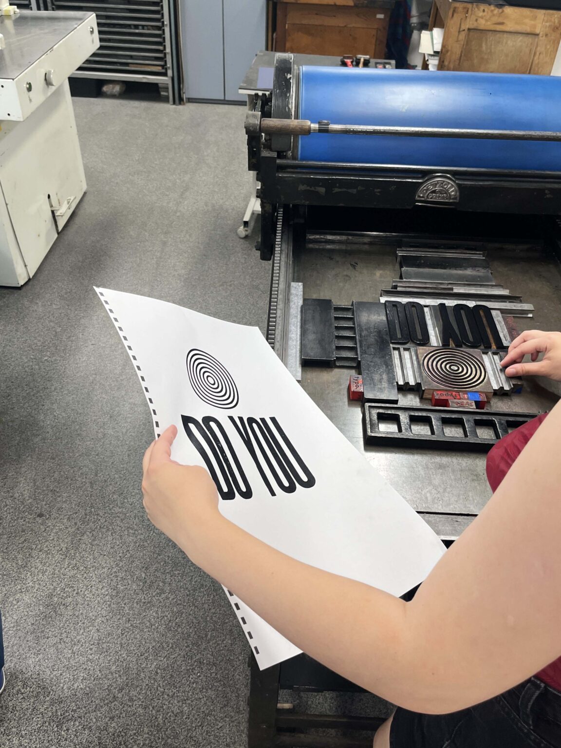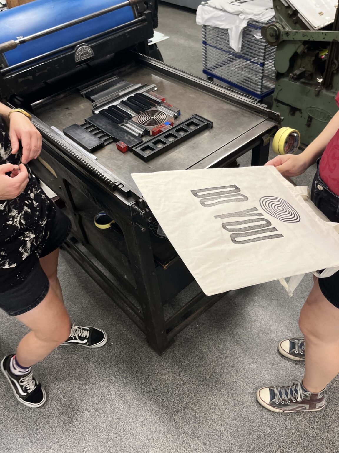 Zadanie polega na zaprojektowaniu prostego przekazu (maksymalnie jednego zdania), złożeniu składu typograficznego (z dostępnych w studio drewnianych czcionek) i odbiciu na T-shirtach przy pomocy prasy typograficznej.