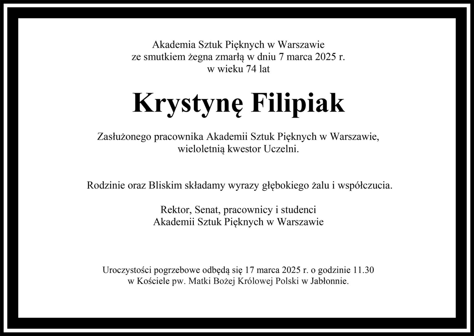 Akademia Sztuk Pięknych w Warszawie ze smutkiem żegna zmarłą w dniu 7 marca 2025 r. w wieku 74 lat Krystynę Filipiak.