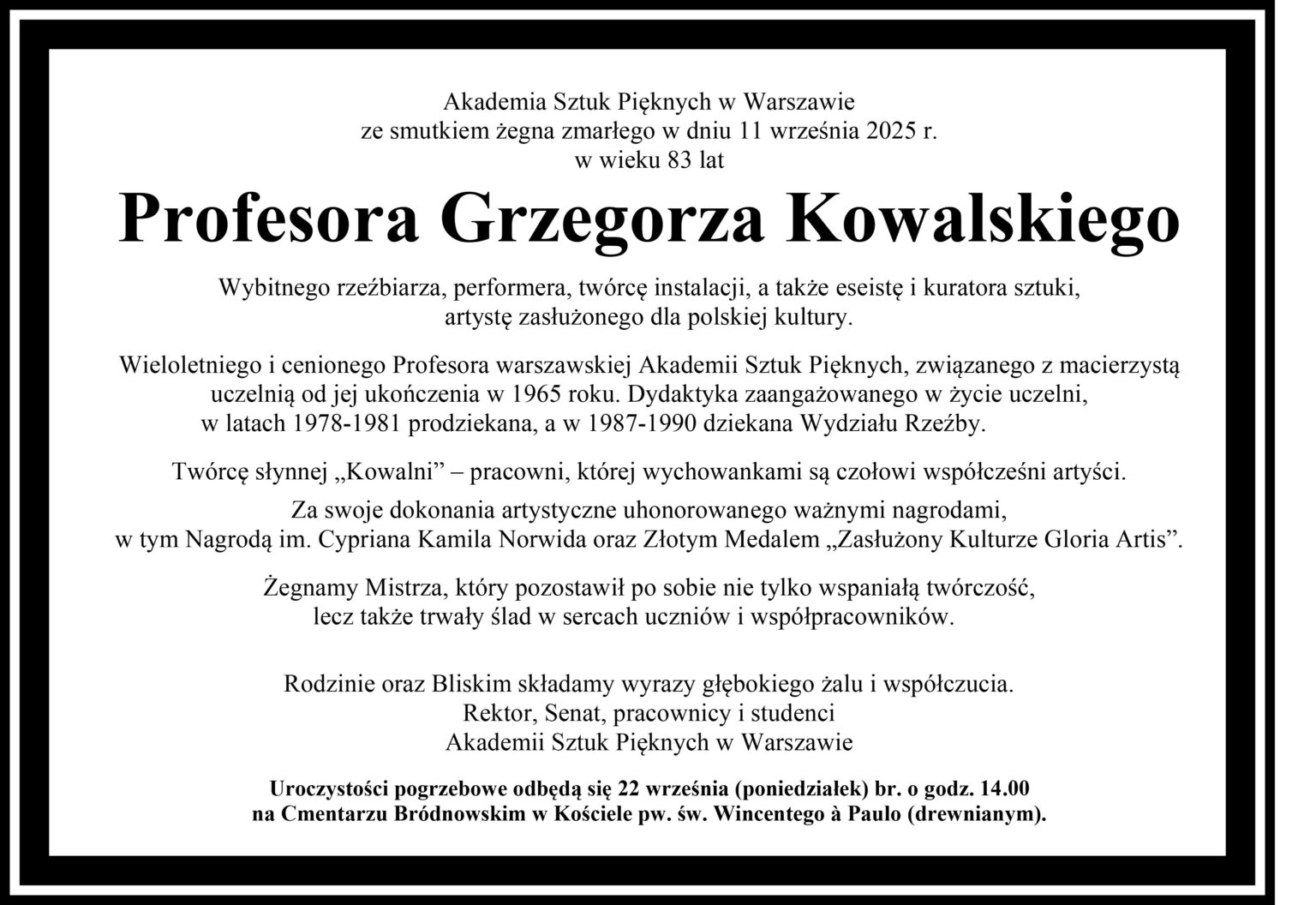 Uroczystości pogrzebowe odbędą się 22 września (poniedziałek) br. o godz. 14.00 na Cmentarzu Bródnowskim w Kościele pw. św. Wincentego à Paulo (drewnianym).