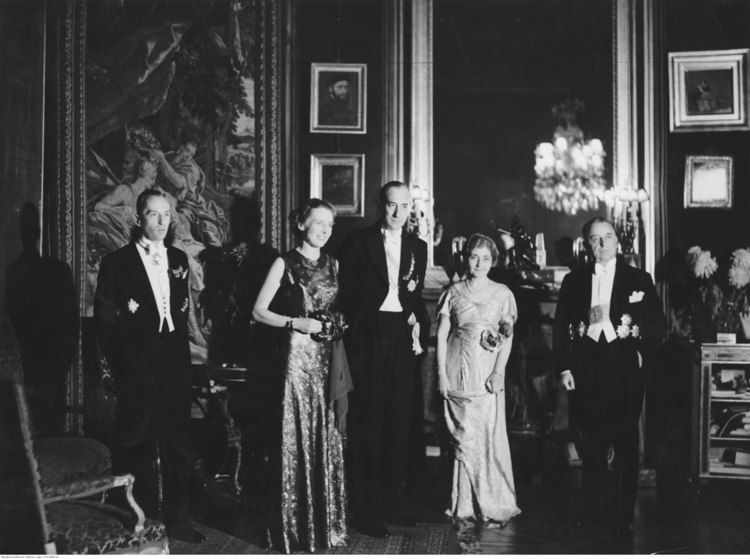 Raut w Pałacu Raczyńskich. 26 XI 1936 r. W centrum minister spraw zagranicznych Polski Józef Beck z małżonka Jadwigą, po prawej minister spraw zagranicznych Rumunii Victor Antonescu z małżonką, po lewej zastępca szefa Protokołu Dyplomatycznego MSZ Aleksander Łubieński. Fot.: NAC