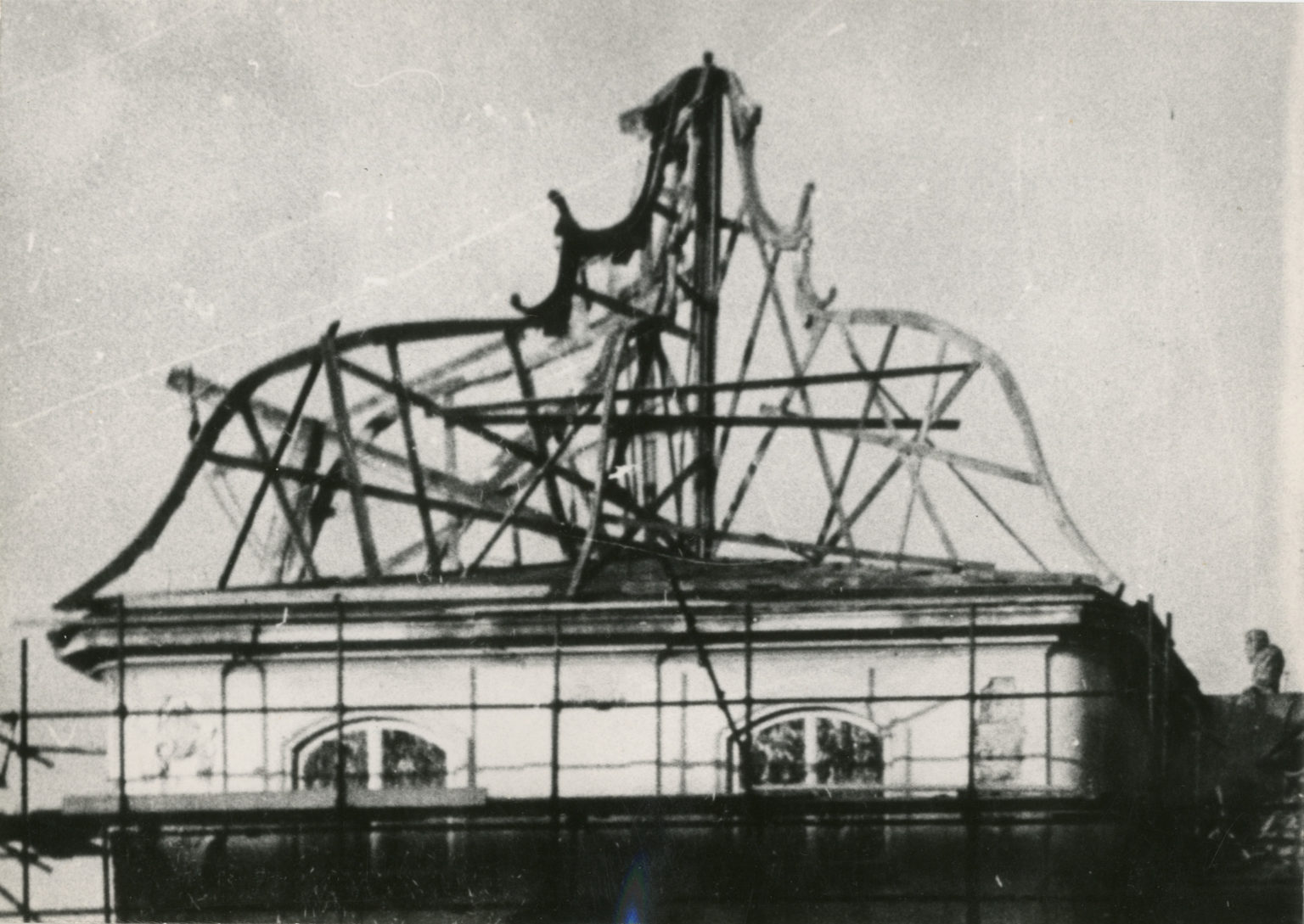 Jeden z hełmów Pałacu Raczyńskich w trakcie odbudowy, lata 50. XX w.