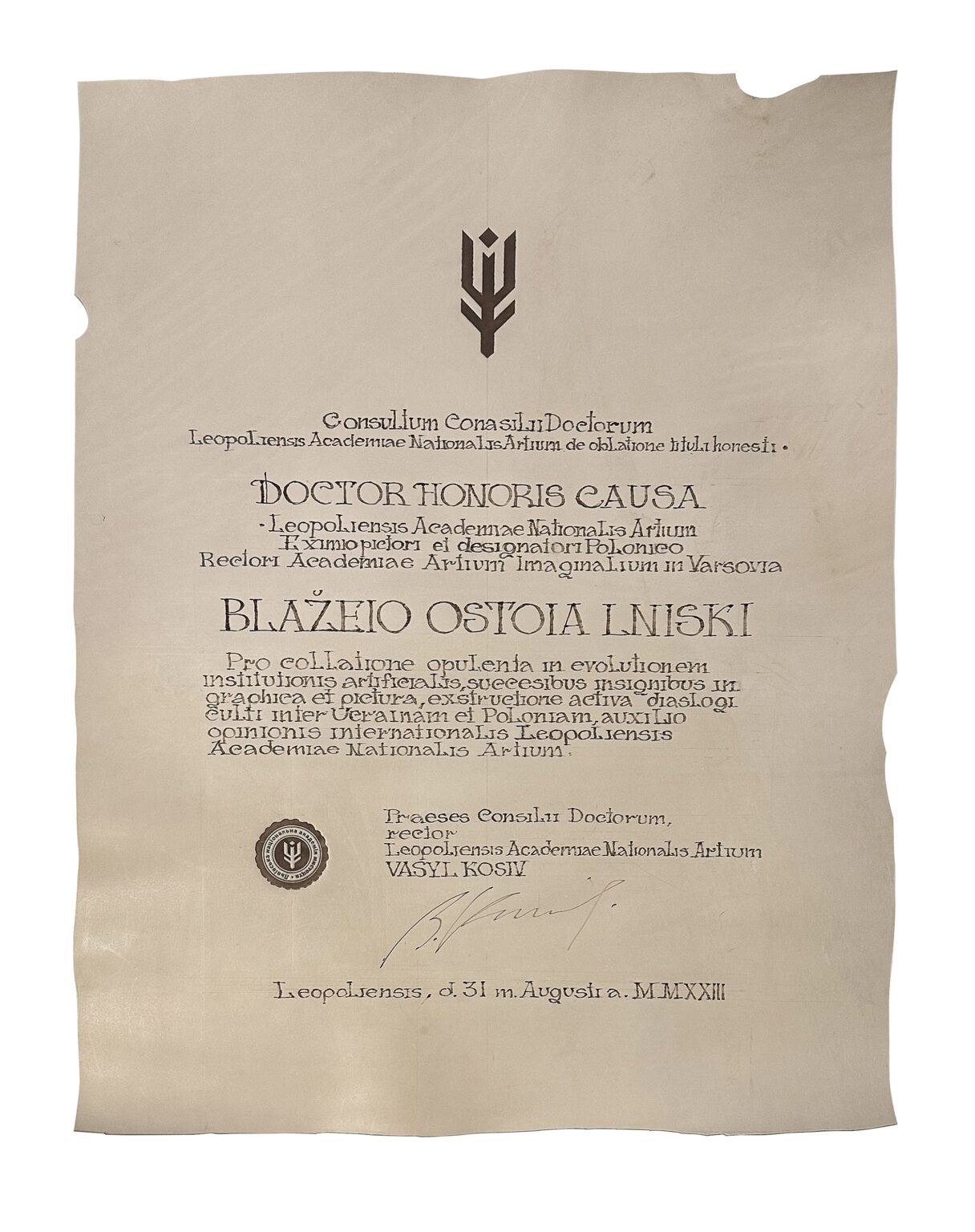 22 października 2023 roku prof. Błażej Ostoja Lniski otrzymał honorowy tytuł doktora honoris causa Lwowskiej Narodowej Akademii Sztuki. Nadanie tytułu odbyło się w schronie, podczas uroczystego posiedzenia Rady Naukowej uczelni z udziałem rektora Lwowskiej Narodowej Akademii Sztuki, Vasyla Kosiva oraz przedstawicieli władz państwowych - mera Lwowa, Andrija Sadowego.