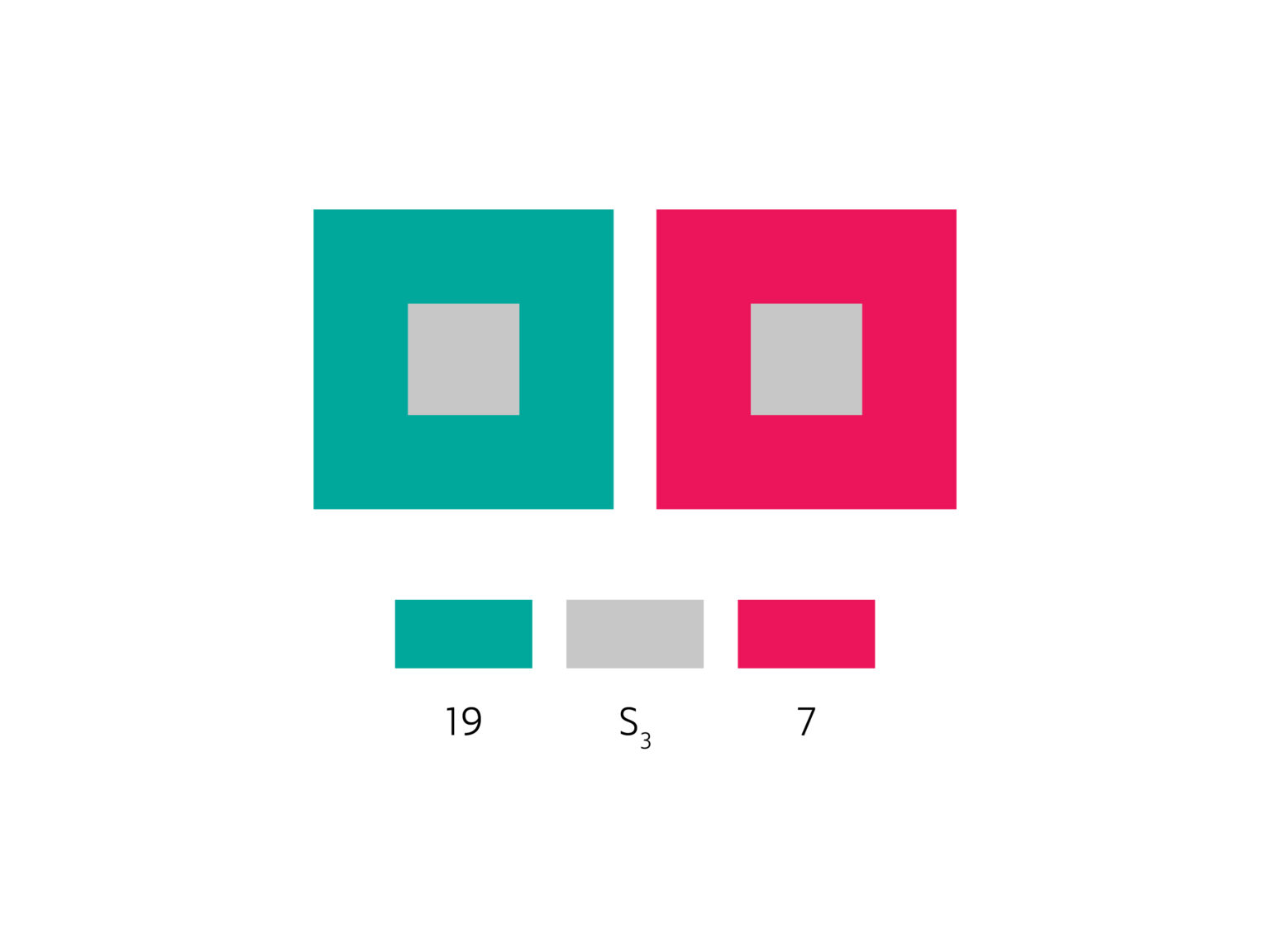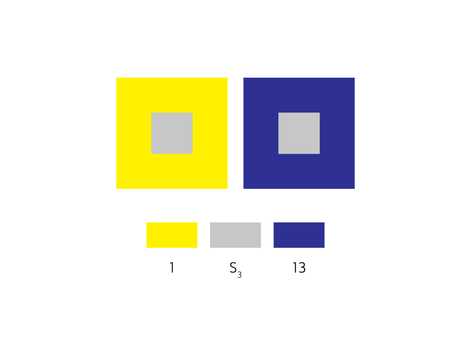 kwadrat żółty po lewej stronie oraz czerwony z mniejszym różowym po prawej stronie.