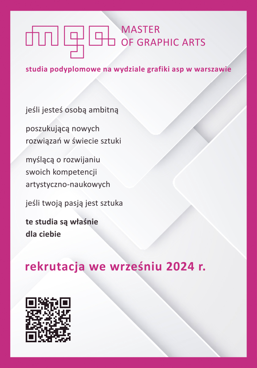 Studia podyplomowe Master of Graphics Arts (MGA) na Wydziale Grafiki Akademii Sztuk Pięknych w Warszawie są dedykowane osobom, które pragną poszerzać swoją wiedzę, umiejętności i kompetencje w obszarze sztuk plastycznych, zarówno w dziedzinie grafiki projektowej, grafiki artystycznej, jak i szeroko rozumianych multimediów, rysunku i malarstwa. Ukończenie studiów MGA da także – osobom, które myślą o dalszej karierze naukowej w dyscyplinie sztuk plastycznych – pełne kompetencje do przygotowania i realizacji przewodu doktorskiego.
