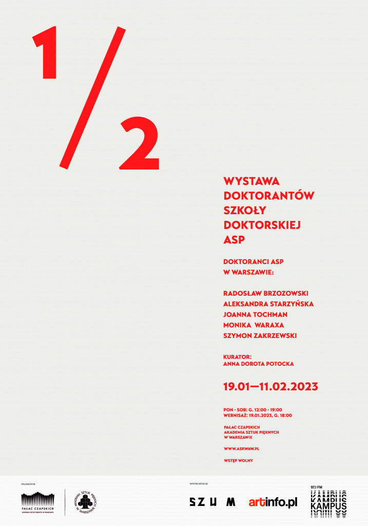 W wystawie zatytułowanej „1/2” bierze udział pięć osób reprezentujących różnorodne dyscypliny artystyczne w ramach jednej dziedziny sztuki – takich jak: sztuki projektowe, sztuki wizualne oraz konserwacja i restauracja dzieł sztuki.  Kuratorem wystawy jest dr hab. Anna Dorota Potocka. prof. Uczelni. 4 lutego 2023 odbyło się oprowadzanie kuratorskie, które przeprowadziły osoby uczestniczące w wystawie: Monika Waraxa, Joanna Tochman i Szymon Zakrzewski.
