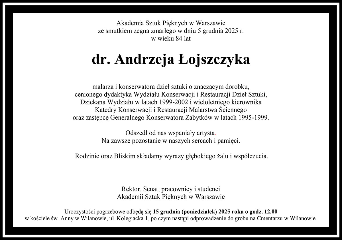 Akademia Sztuk Pięknych w Warszawie ze smutkiem żegna zmarłego w dniu 5 grudnia 2025 r. w wieku 84 lat dr. Andrzeja Łojszczyka.