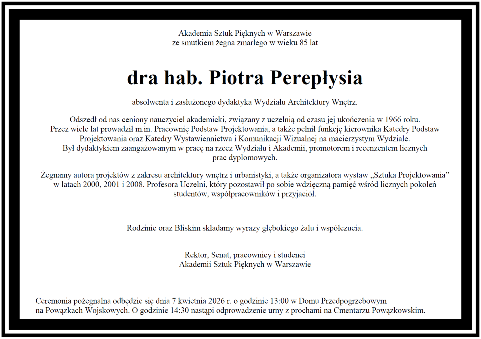 Akademia Sztuk Pięknych w Warszawie ze smutkiem żegna zmarłego w wieku 85 lat dra hab. Piotra Perepłysia absolwenta i zasłużonego dydaktyka Wydziału Architektury Wnętrz.