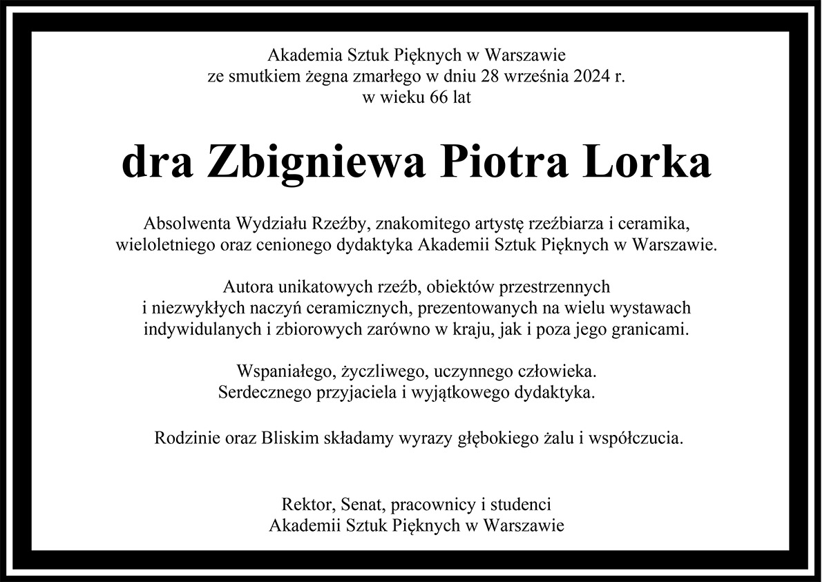 Akademia Sztuk Pięknych w Warszawie ze smutkiem żegna zmarłego w dniu 28 września 2024 r. w wieku 66 lat dra Zbigniewa Piotra Lorka.