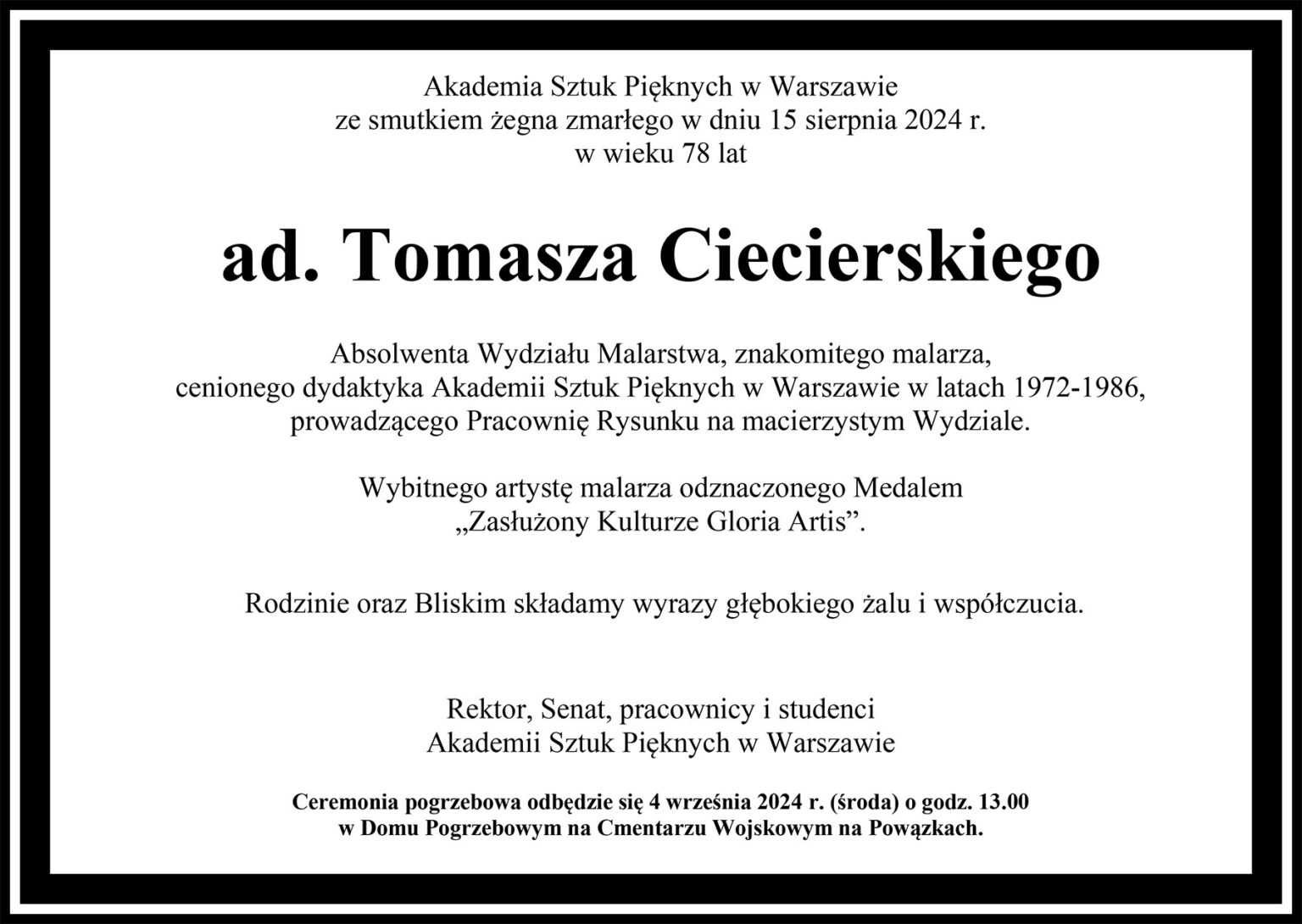 Akademia Sztuk Pięknych w Warszawie ze smutkiem żegna zmarłego w dniu 15 sierpnia 2024 r. w wieku 78 lat ad. Tomasza Ciecierskiego.